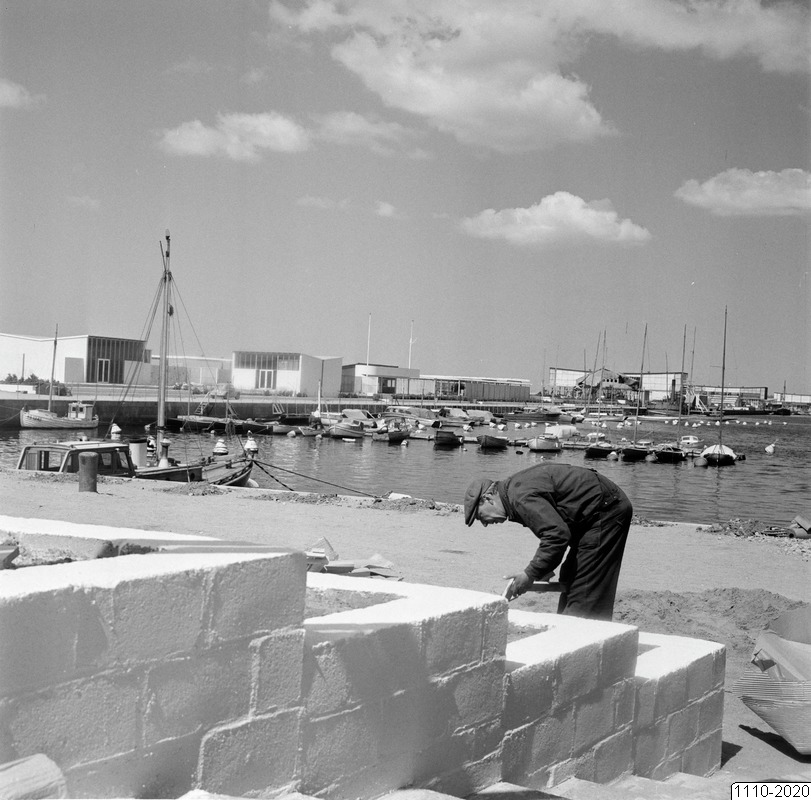 Bilden föreställer en man som håller på att mura en mur. I bakgrunden hamn, båtar och Parapeten med paviljonger.