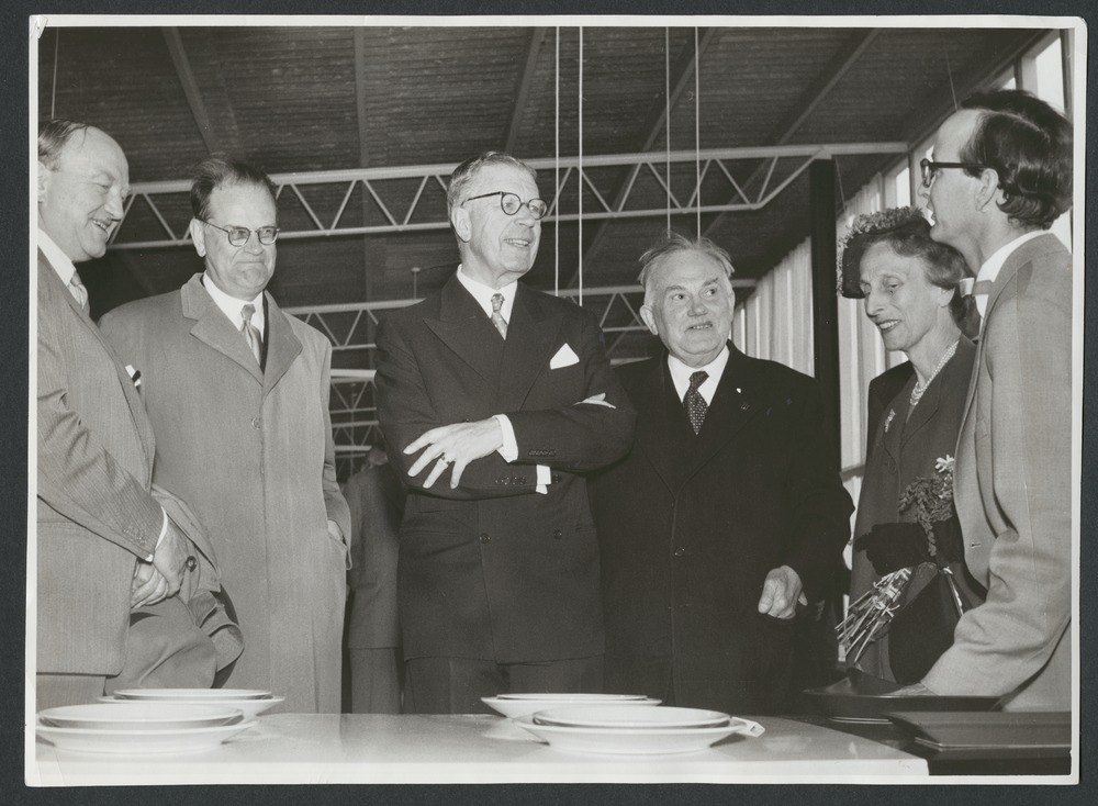 Bilden föreställer från vänster Börje Skarstedt, Tage Erlander, Gustav VI Adolf, Anders Persson, Louise, Stig Lindberg. De står samlade vid ett bord med tallrikar inomhus i en utställningshall.
