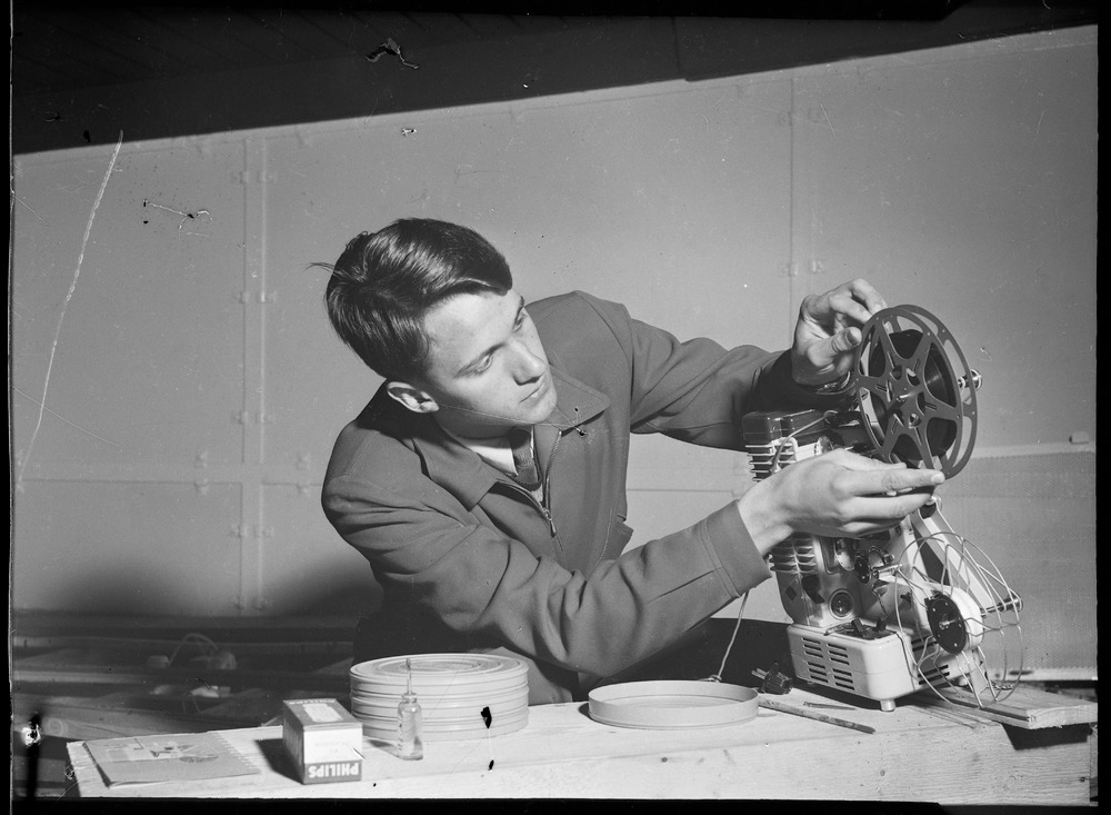 Bilden föreställer en man fotograferad i halvformat. Mannen håller på att ladda en filmprojektor.