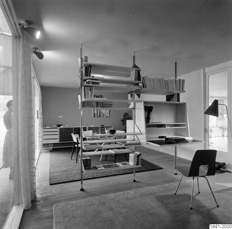 Bilden föreställer ett kontorsrum mot en glasvägg och bakom den ett matrum med skåp. På glasväggen sitter hyllor bland annat en med skrivbord. Där står också en stol och en lampa.