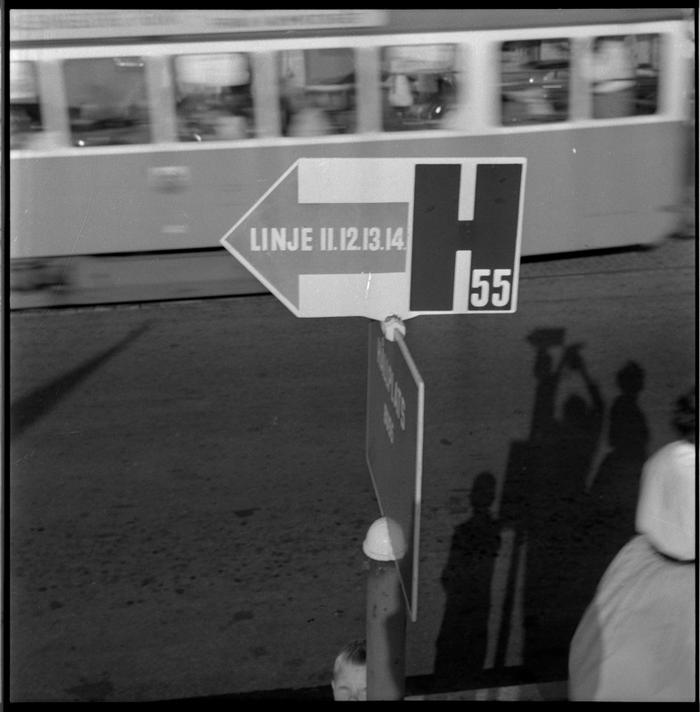 Bilden föreställer en skylt till en busshållplats med H55 logotypen och texten Linje 11 12 13 14. I bakgrunden en buss.