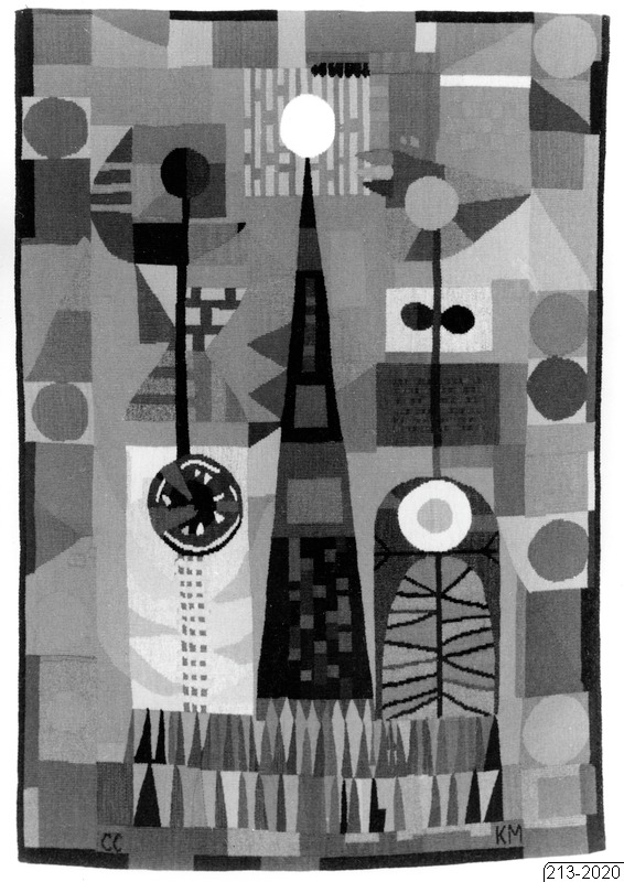 Bilden föreställer "Zorongo" komp Kaisa Melanton. Väggbeklädnad med geometriska mönster. På baksidan står det Returneras till Föreningen Handarbetets Vänner.