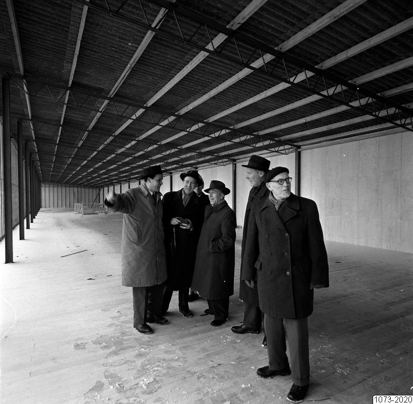 Bilden föreställer fem herrar fotograferade i helfigur stående under ett tak.