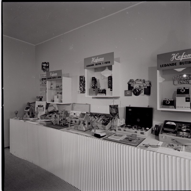 Fotografi som avbildar Hefomas stånd på Expo58. På bilden ser vi en disk med kameror och annan elektronik och tillbehör.