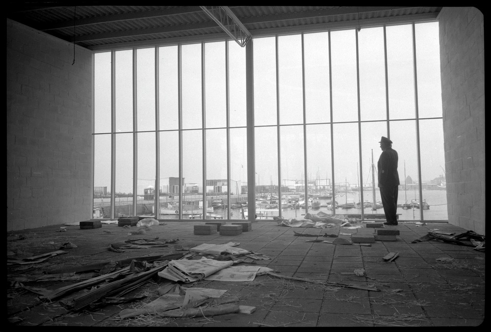 Bilden föreställer insidan av en paviljong under uppförande. I bakgrunden en glasfasad vid vilken står en människa.