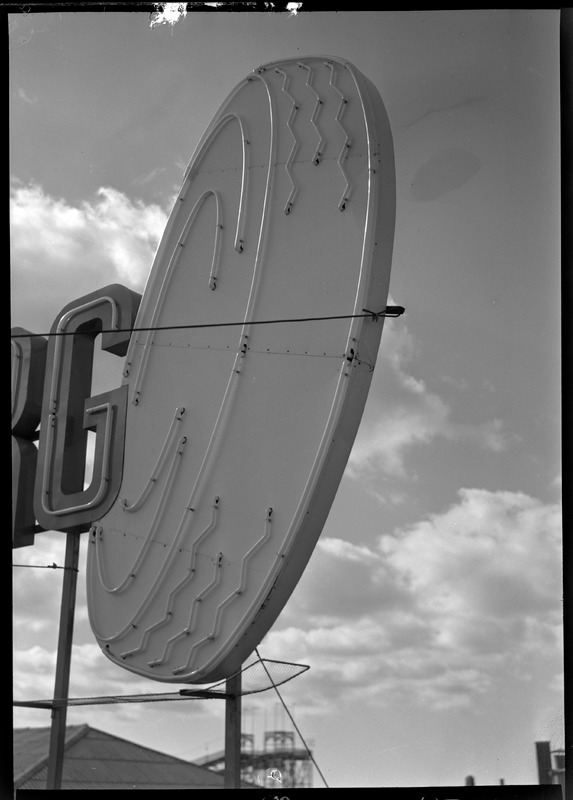 Bilden föreställer högra delen av en neonskylt med bokstaven G och sedan en rundplatta med ett c och med vågmönster. I bakgrunden himmel