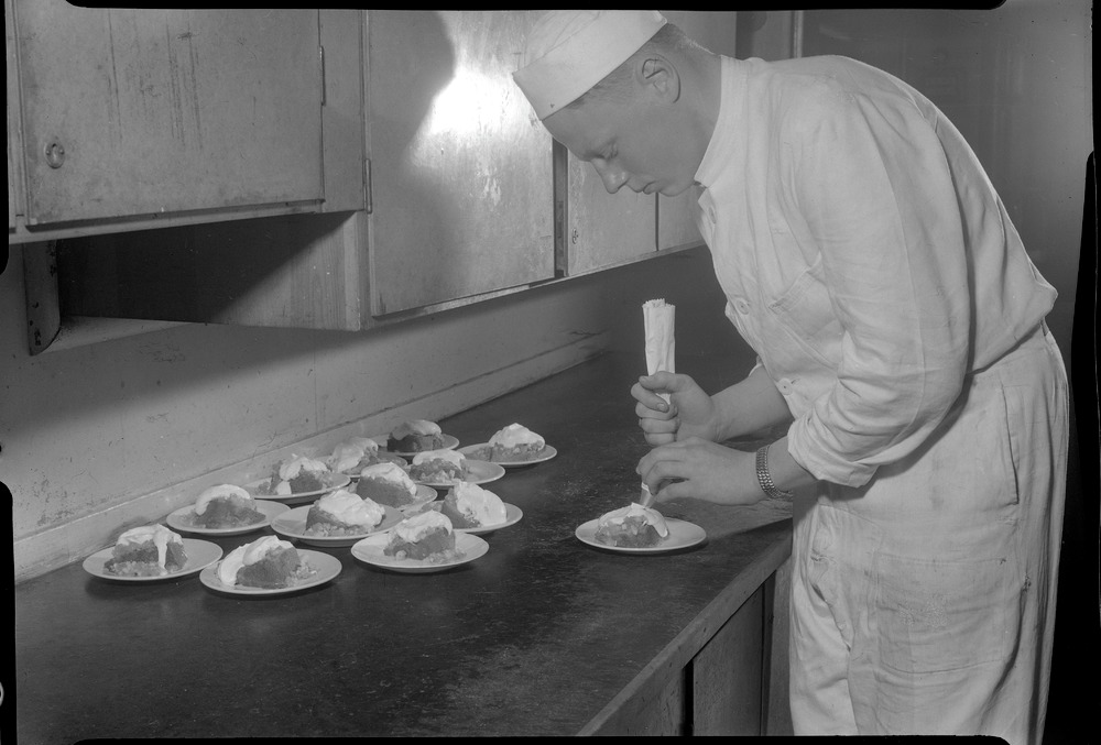 Bilden föreställer en man i trekvartsformat i köksklädsel som spritsar grädde på ett bakverk på asietter i köksutrymme.