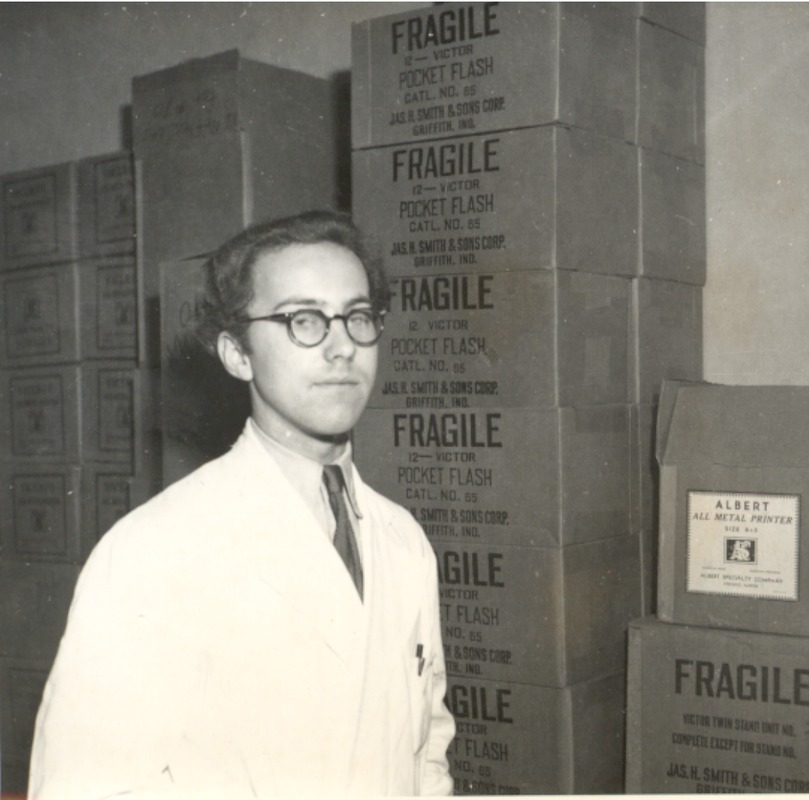 Fotografi som avbildar en okänd man framför en mängd lådor. Fotografiet är troligen taget i Hefomas affär på Järnvägsgatan 3 någon gång på 1900-talet. Se även DIG_2020_1006 och DIG_2020_1019 för bilder av Eric Lindblad som verkar vara taget vid samma plats och tidpunkt.