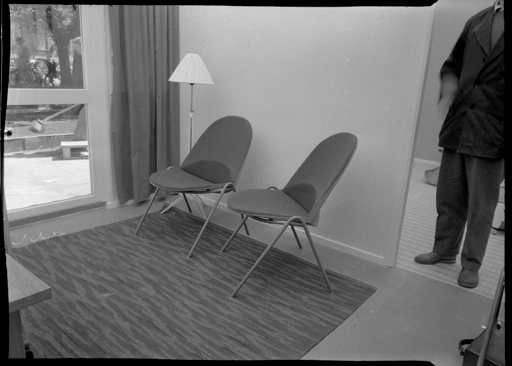 Bilden föreställer en hörna i en byggnad med matta på golvet på vilken står två stolar och en lampa, till höger ses en del av en människa.