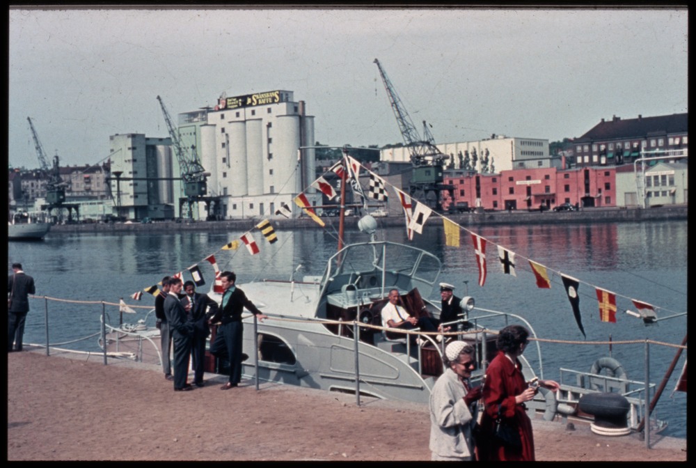 Bilden föreställer i förgrunden kajkant med flanerande människor. id kajen ligger en båt med en långrad vimplat med världens olika flaggor. I bakgrunden hamn och industribyggnader.