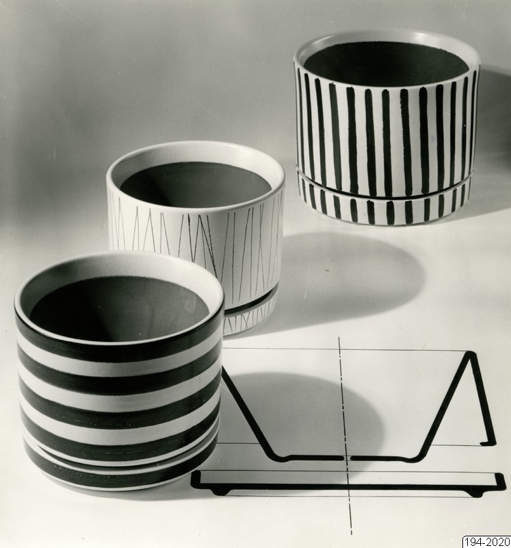 Bilden föreställer "Floreskrukan" PAT.S. Komp: Stig Lindberg, Gustavsberg. Tre krukor med fat. De har olika mönster iform av olika ränder.
