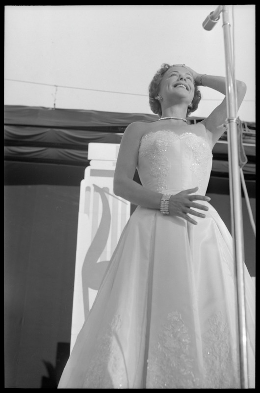 Bilden föreställer en kvinna i nästan helfigur i grodperspektiv stående vid en mikrofon, sångerska(?). I bakgrunden scenfasad.