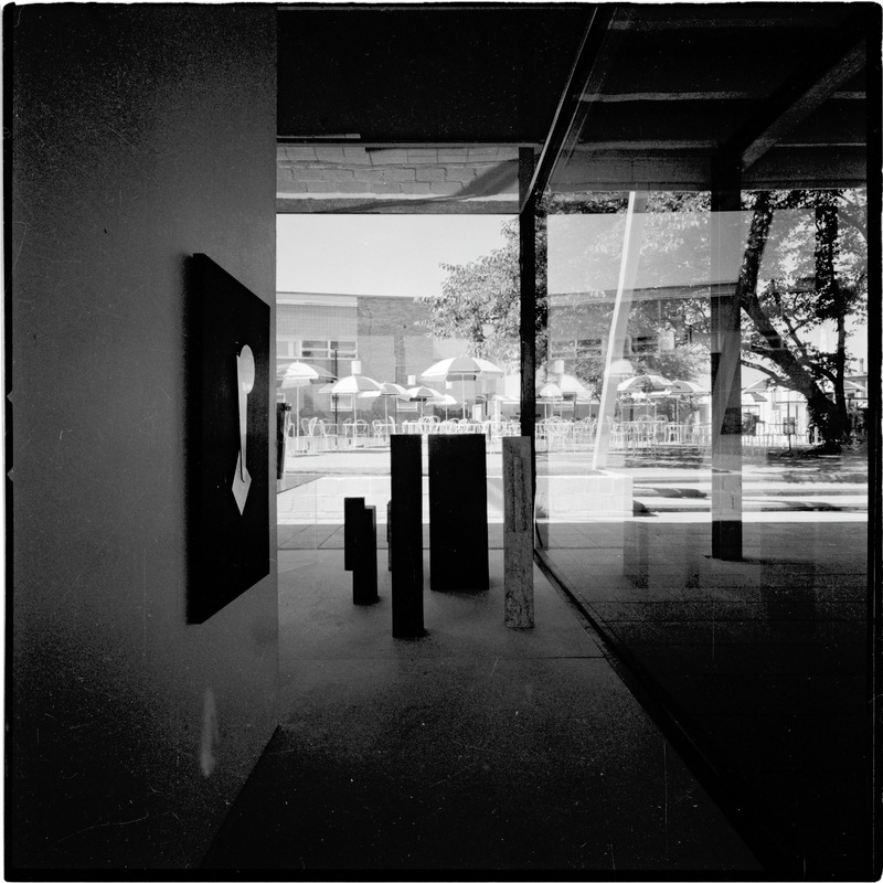 Bilden föreställer en överbyggd gångbana, med fasad med konstverk till höger. I bakgrunden uteservering samt fler byggnader.
