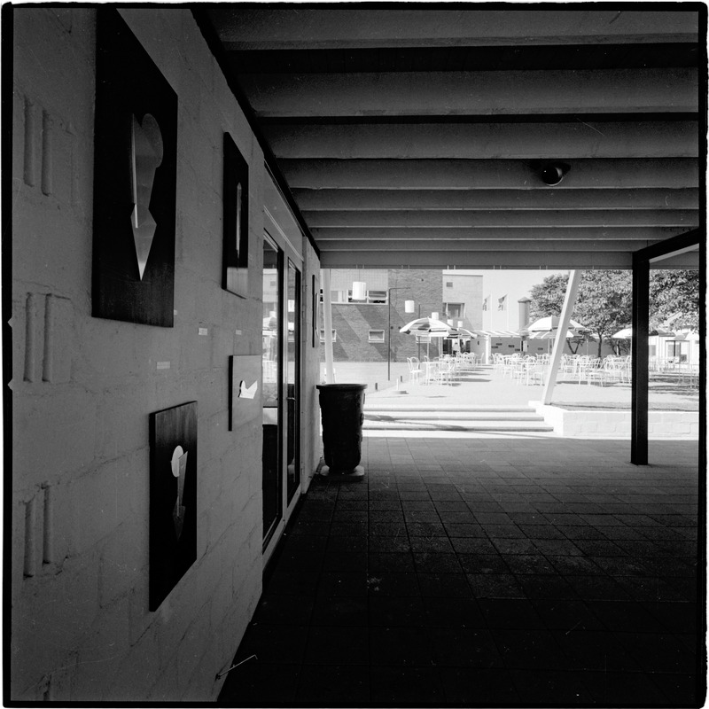 Bilden föreställer en överbyggd gångbana, med fasad med konstverk till höger. I bakgrunden trappa och uteservering samt fler byggnader.