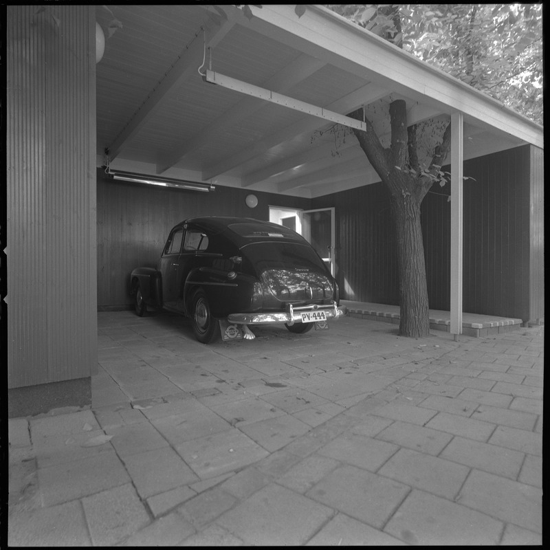 Bilden föreställer en carport med en bil. Taket är byggt runt ett träd. Marken är stenlagd.