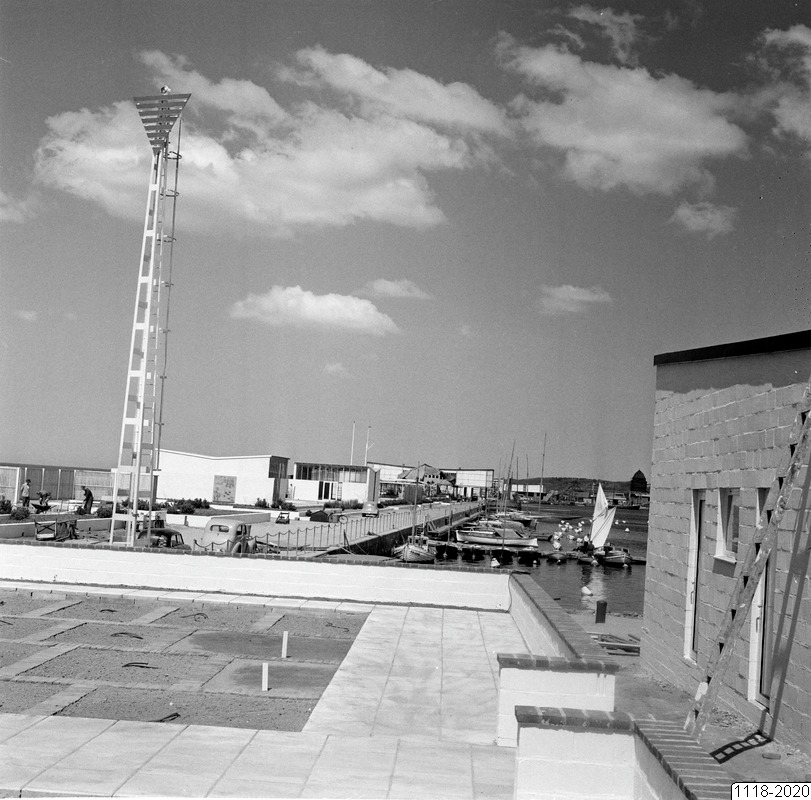 Bilden föreställer en hörna av en låg mur runt en rektagulär yta. Till vänster en fasad. I bakgrunden paviljonger, hamn och båtar.