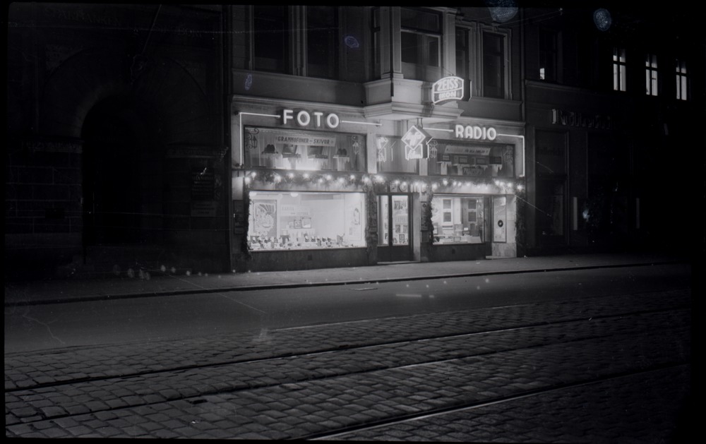 Fotografi som avbildar den juldekorerade fasaden och skyltfönsterna på Hefomas butik på Järnvägsgatan efter ombyggnaden av fasaden och före ombyggnation av byggnaden 1957-58.