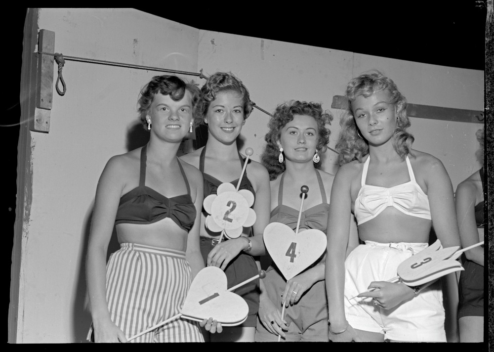 Bilden föreställer fyra kvinnor fotograferade i trekavsrtsfigur iklädda bikini, och med varsin skylt med sifran 1,2, 3 respektive 4. De står framför en skärm.