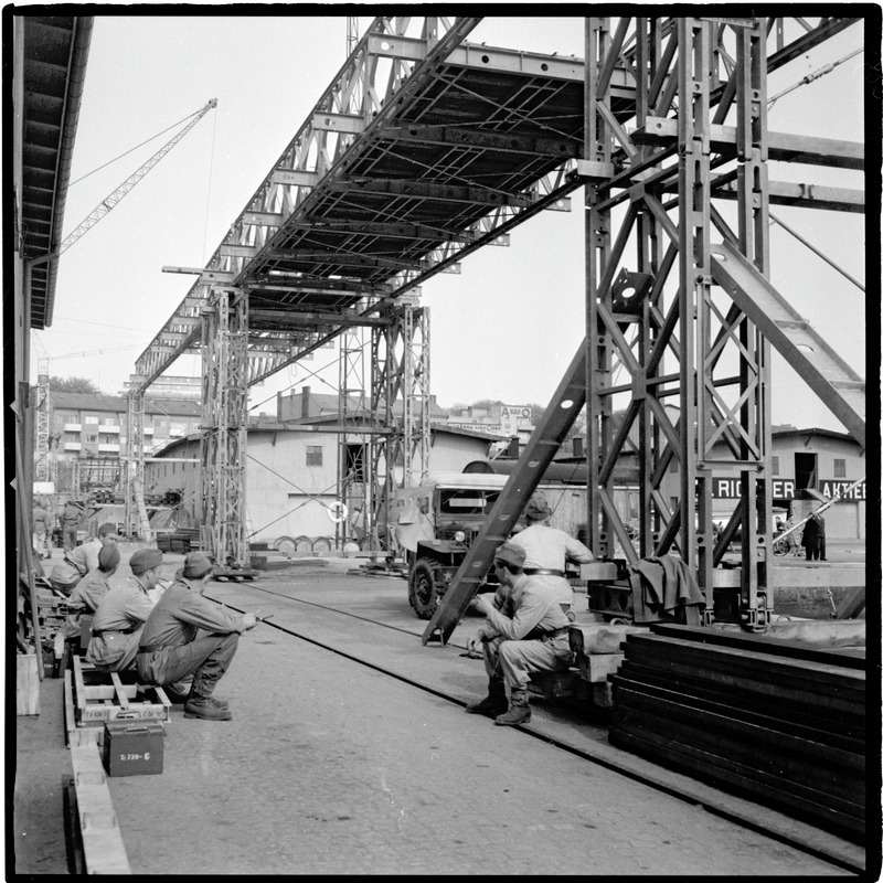 Bilden föreställer stomme eller regelverk till byggnad. På marken sitter ett antal personer. (gångbro?)