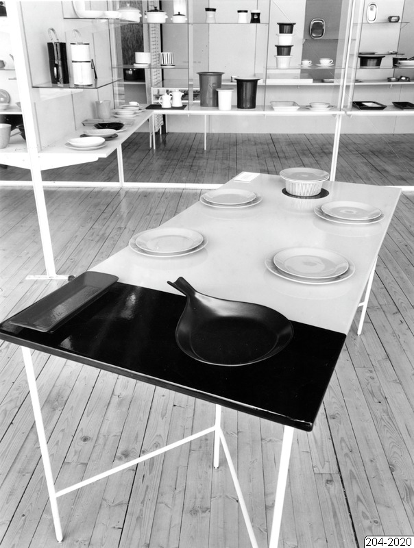 Bilden föreställer det varma bordet, Stig Lindberg. Tillverkare: AGA - Gustavsberg. På bilden i förgrunden bord med fat och tallrikar samt en karott. I bakgrunden hyllor med tallrikar, fat och krukor.