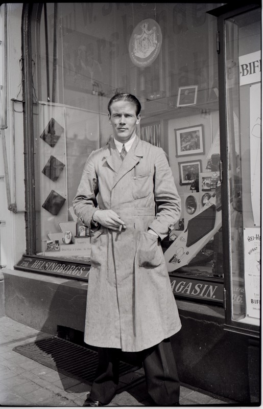 Fotografi som avbildar en rökande man i rock, mannen står framför Hefomas butik på järnvägsgatan före ombyggnaden av fasaden.