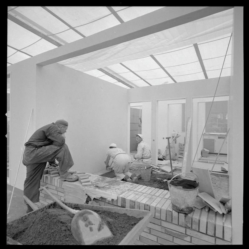 Bilden föreställer en paviljong under uppbyggnad. Arbete pågår med murning inomhus. Murare med hink, skottkärra och spade.