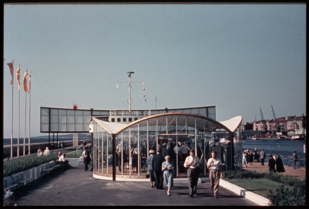 Bilden föreställer utställningsområdet med promenadstråk och paviljonger. Några personer flanerar.