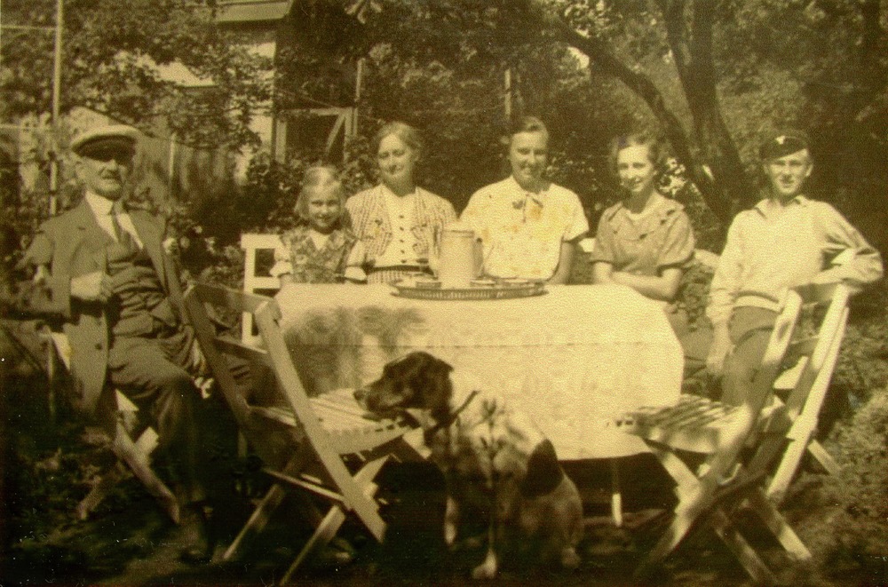 Familjen Blandford sitter tillsammans i trädgården i Fjärestad. Framför trädgårdsbordet sitter hunden Tuttan.