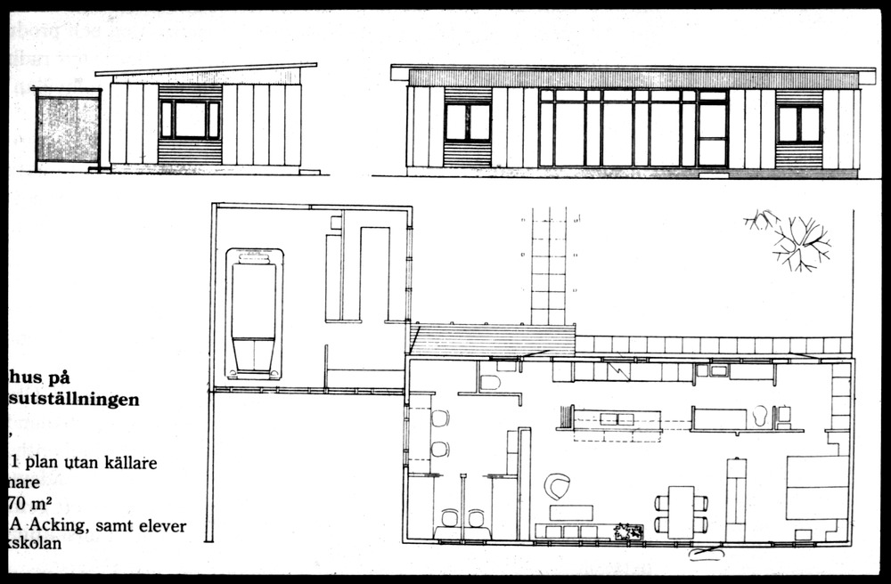 Bilden föreställer fasad på enplanshus samt ritning över bostad och garage.