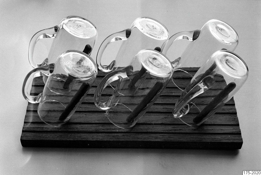 Bilden föreställer 6 ölmuggar på ett ställ.