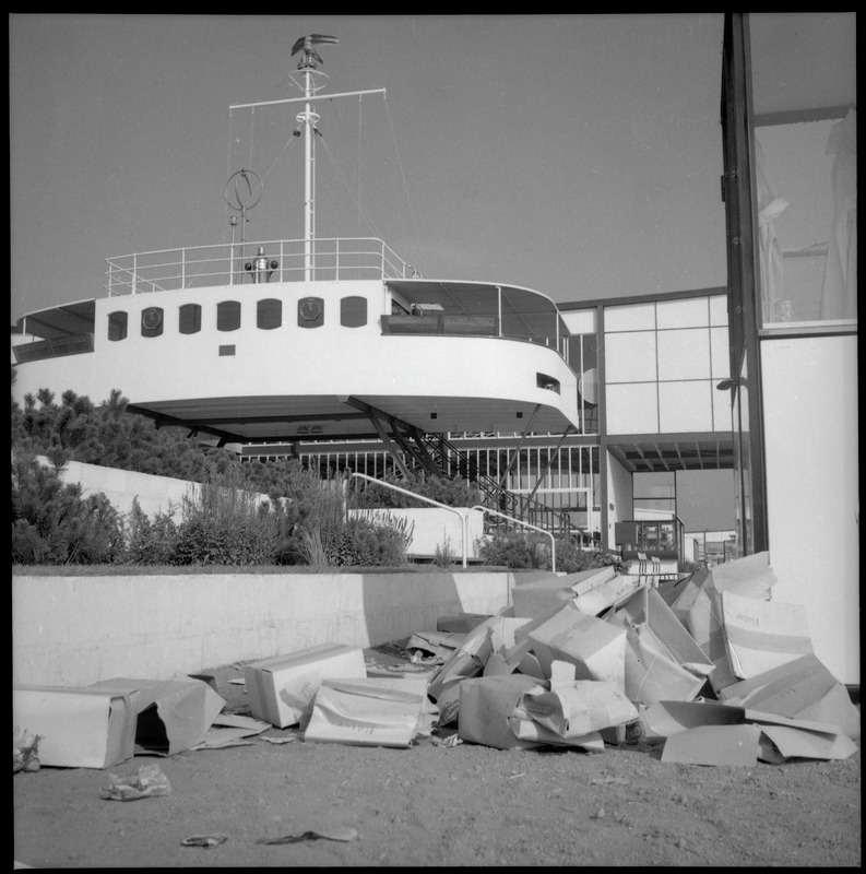 Bilden föreställer en yta framför en mur ligger en hög med skräp, gamla kartonger. Bakom växer buskar och ytterligare bakom ligger byggnader