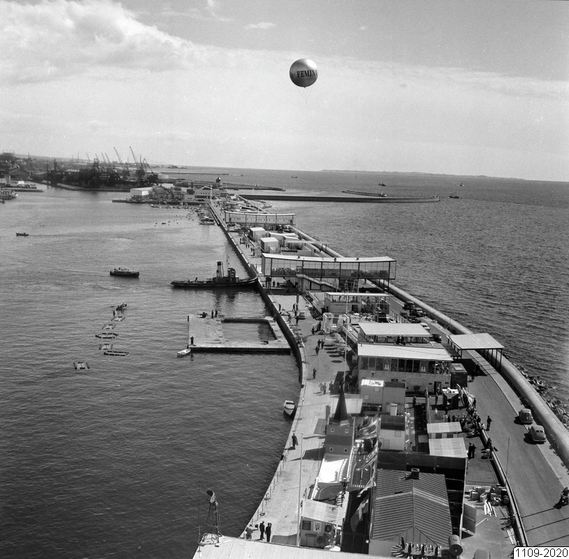 Bilden föreställer en flygbild på Parapeten med sina paviljonger till vänster hamnen.