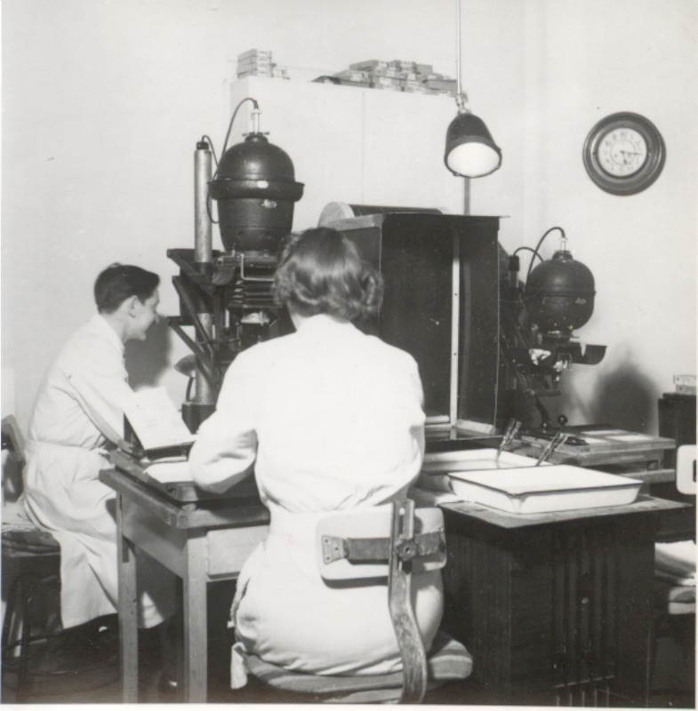 Fotografi som avbildar en okänd kvinna och man arbetandes vid bord med kameror. Bilden är troligen tagen i Hefomas labb på Järnvägsgatan 3 eller på en av deras filialer, kanske på Södergatan.