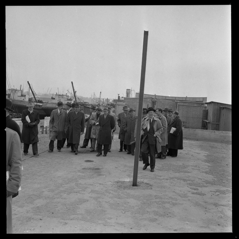 Bilden föreställer en grupp herrar stående på Parapetenområdet. Två har mapp under armen.