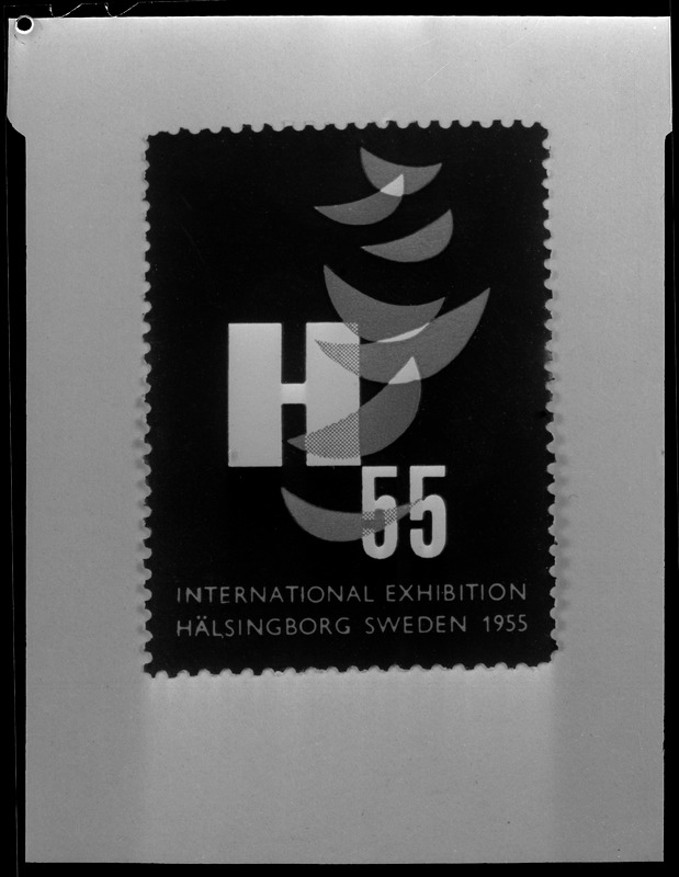 Bilden föreställer ett frimärke med texten H 55 och spridda halvmånar. Undertill står det International exhibition Hälsingborg Sweden 1955.
