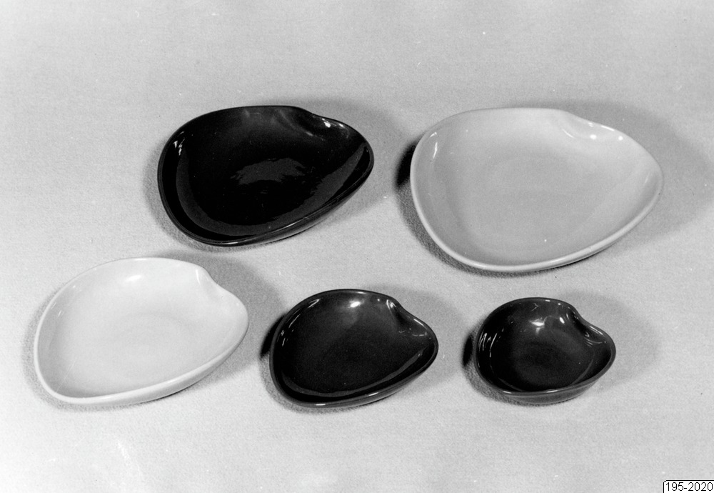 Bilden föreställer "Taffel" Färgglatt ugnseldfast hushållsgods. Färger: oliv, viol, rost, gul, svart. Utförande S.O. Burmeister. På bilden fem tallrikar med olika form, ljusa och mörka.