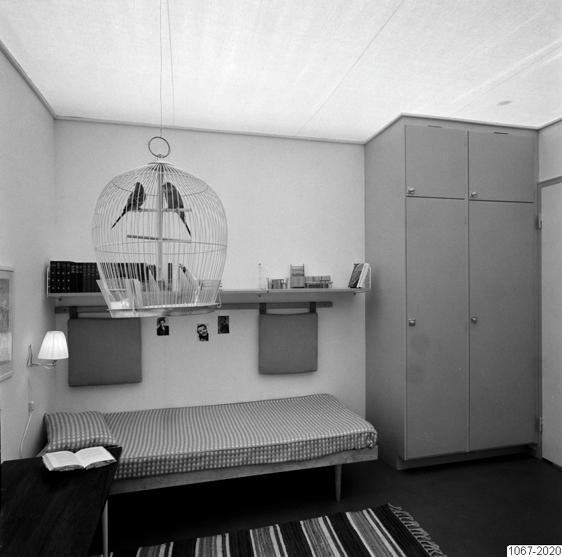 Bilden föreställer en hörna av ett rum. Vid kanten står ett bord med en säng vid väggen bakom, över den en hylla. I taket hänger en fågelbur med fågel i. Vid sidan står ett skåp.