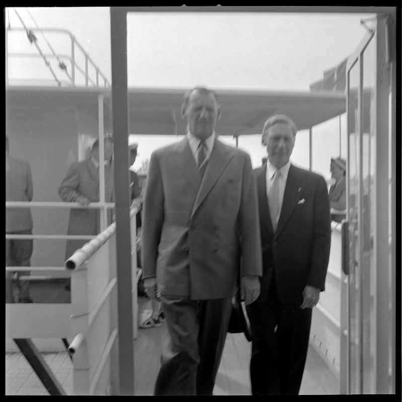 Bilden föreställer två män gående i en hall. I bakgrunden ytterligare personer.