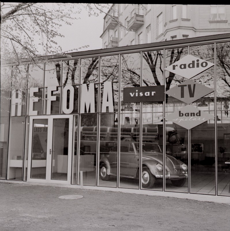 Fotografi som avbildar en glas och stålbyggnad som inhyser Hefoma för "Mabar E1957". Bilden avbildar en stor reklam skylt: "Hefoma visar radio, TV, Bandspelare", innuti byggnaden syns en Volkswagen Typ 1 bubbla.