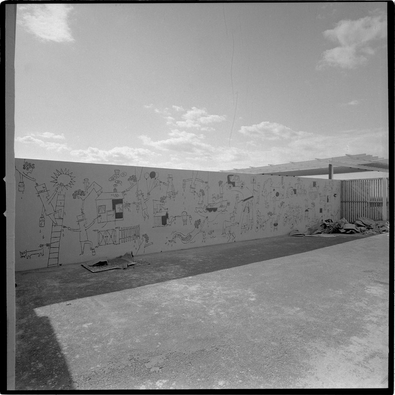 Bilden föreställer en stor öppen yta. I bakgrunden hög mur eller fasad helt fylld med figurer.