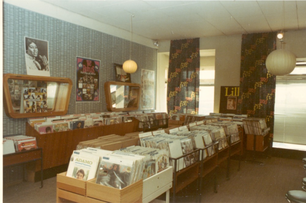 Färgfotografi från 1960-talet som avbildar insidan av Hefomas affär på Järnvägsgatan 3. Fotografiet avbildar här grammofon avdelningen. Till höger ser vi sätena till platsen där man lyssnar på grammofon skivor precis utanför bilden.