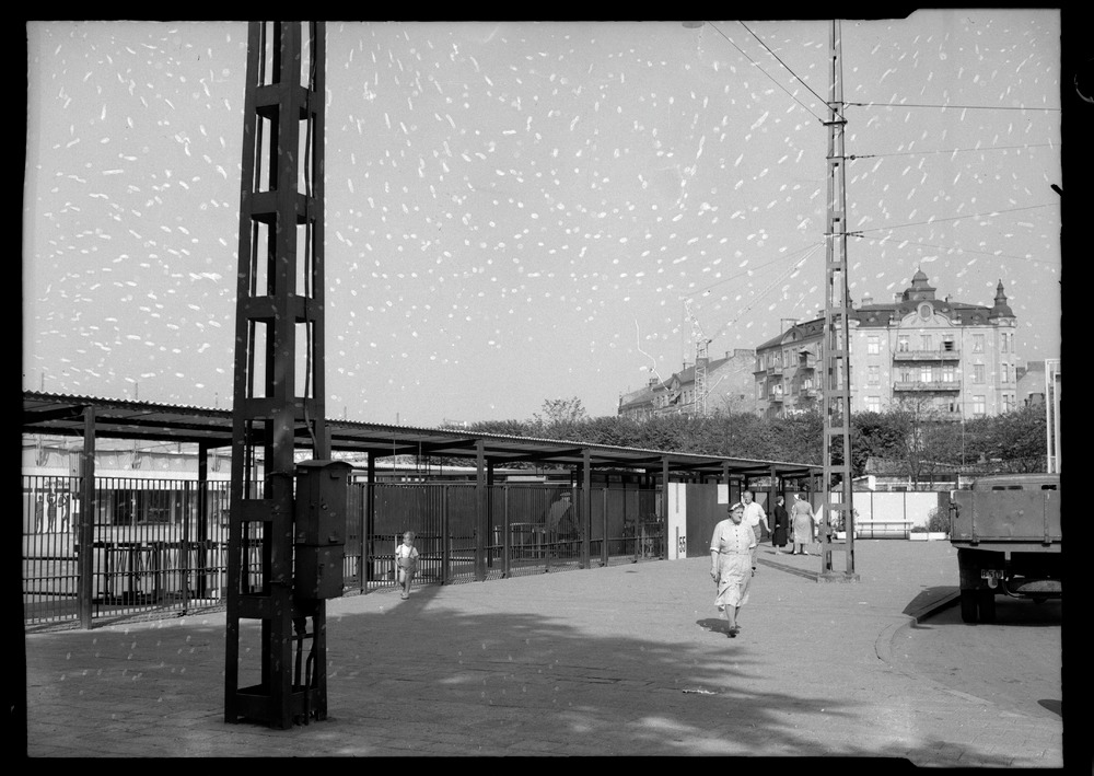 Bilden föreställer entré området till H55. Öppen yta, staket och grindar samt några besökare. I bakgrunden byggnad.
