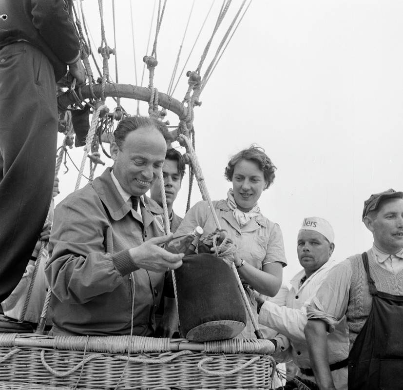 Bilden föreställer korgen till en luftballong. Där är flera människor i korgen och ett par bakom.