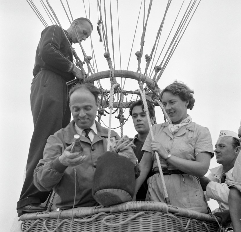 Bilden föreställer korgen till en luftballong. Där är flera människor i korgen och ett par bakom.