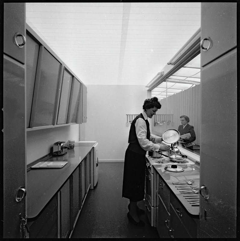 Bilden föreställer ett långsmalt kök. Till vänster bänk med skåp nedtill och skåp upptill. Till höger bänk och spis, vid vilken en kvinna står och tillagar något.