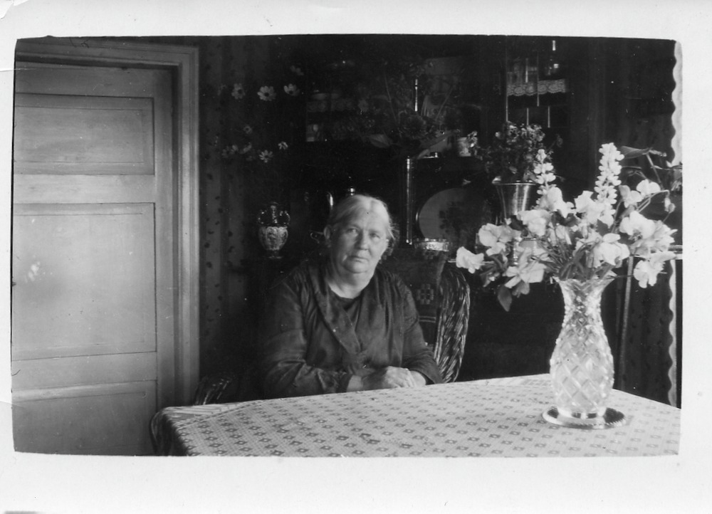 Porträtt av Bengta Olsson. Bengta Olsson sitter vid ett bord med en blomvas framför sig.