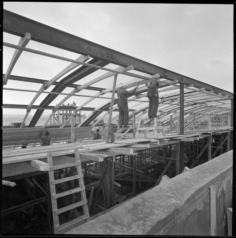Bilden föreställer en paviljong under uppbyggnad. Plan två med välvt tak och två byggnadsarbetare. Där står en stege.