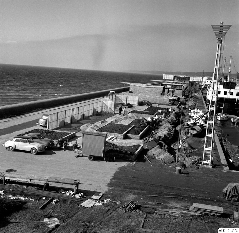 Bilden föreställer utsikt över parapeten med paviljonger. Till vänster en båt till höger hav i förgrunden ett par bilar. Där ligger också högar med olika beläggningsmaterial