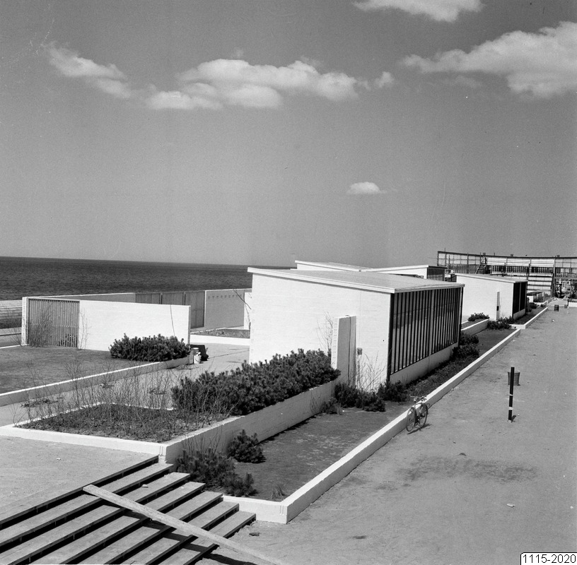 Bilden föreställer ett utsnitt, översikt, av Parapeten med paviljonger. I förgrunden trappa och plantering, till vänster gångstråk.