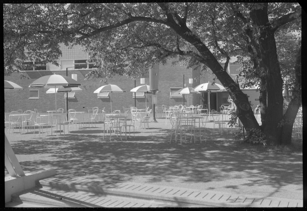 Bilden föreställer en öppen yta med ett träd till vänster. Bakom detta ligger en utesevering med bord, stolar och parasoll.